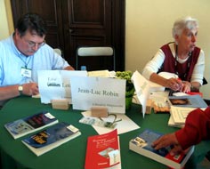 C'était calme et assez bizarre. Il faisait gris et brouillasse le matin, dégagé l'après-midi mais toujours gris. Il y avait un côté intime, campagnard, fête du village, mais aussi un côté bazar sans trop de monde, kermesse sérieuse avec recueillement ouaté dans la verdure. La sonorisation n'était pas braillarde... - Vous avez dit bizarre ? - Peut-être tout simplement la tristesse douce et calme des dimanches gris, avec quelques livres, quelques rencontres, et le si beau regard d'une femme au pull noir et robe rouge... |