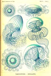 ![]() Mais sa grande spécialité fut les méduses, à tel point de d'appeler sa villa Medusa, à Iéna et où il installe aussi le musée de phylogénie. Dans l'architecture et les aménagements, on y trouve les méduses, comme ce chandelier, d'après une méduse qu'il avait trouvée lors de son voyage à Ceylan (et que l'on retrouve comme la planche 28 du livre déjà cité):