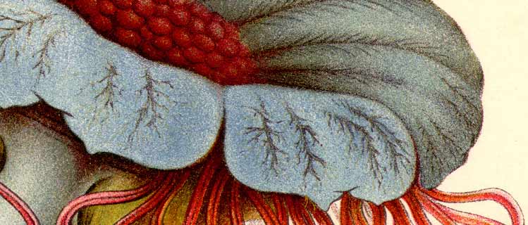 complexes et originaux." Comment résister à la tentation de ne pas glisser dans cette croix son doigt, sa langue ou son sexe ? Tentation crucifiante d'explorer le gouffre à l'entrée tapissée de rideaux humides, carresser les lèvres goulues qui vous y invitent et qui l'entourent comme autant exquises tentures d'un tissu luxueux rare et exotique ? Certes les longs tentacules qui sifflent autour comme autant de serpents sont là pour rappeler l'enfer qui nous attend, sous les masses oranges réconfortantes des gonades qui pendent comme fruits du paradis. Car bien sûr il s'agit la la bouche de la bête. Et ce n'est pas par hasard que Haeckel a dessiné cet animal, et précisemment cette planche-là." Il s'agit en effet d'une des