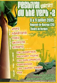 C'est au théâtre de verdure.On peut s'asseoir sur les gradins, se coucher dans l'herbe ou se tenir debout devant la scène. On peut boire de la bière, du kir, manger des frites et bien sûr des pâtisseries marocaines. On peut prendre du recul et écouter de loin, dans le petit jardin public attenant, jouer avec son chien, ou fumer ce ce qu'on veut. C'est gratuit avec fouille légère à l'entrée. Le son est bon, pas trop fort, bien réglé et bien balancé. La musique ? : Ça va "du subtil mélange ska et altermondialiste, festif à souhait, garanti sans OGM ", au " tibétain, assemblage de didjéridoo, dub hypnotique et rock survolté ", du " jazz manouche version Django revisité façon Samarabalouf " au " puissant arôme dub ethnique, métal aérien, indus ou trance préparé par 6 apprentis-sorciers..." |