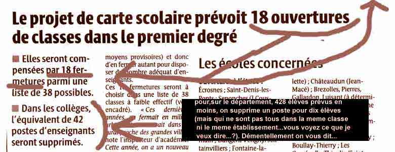 La réalité est pire bien sûr. À l'intérieur, page 4, ils recommencent le coup du titre, en rajoutant une petite gâterie sur les collèges, mais rien sur les lycées (-67 postes en lycées pour l'Académie). |