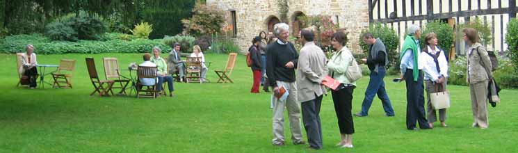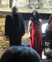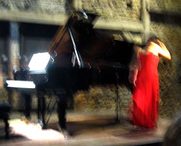 (au moins pour le spectateur), sans se toucher .Il y a, en plus d'un risque, d'une partie qui se joue sur une corde raide, de la connivence, de la complicité, de l'intimité. Pas étonnant que beaucoup de duos pianistiques sont aussi dans leur vie privée " ensemble ", ce qui est le cas ici. Il faut du désir pour jouer à quatre mains. Mais se partager un piano et dormir dans le même lit ne sont pas comparables. Ici la femme, en robe rouge, joue la partie primo (partie aigue, à droite du clavier, en général qui se lit en clé de sol. L'homme joue la partie secundo (en clé de fa)... C'est le secundo qui met la pédale, pour lui, mais aussi pour la partie primo. Pas sympa pour le primo s'il ne lui la met pas quand il faut ! À l'entracte tout le monde se rue dans les jardins, fume sa cigarette, ou pour nos amis anglais dans la cafétaria, non pour admirer l'impressionnant pressoir du XVè siècle, mais pour boire le cidre local. ![]() ![]() ![]() Jacques Lenot monte sur scène, présente et remercie ses interprêtes, raconte un peu la genèse de cette pièce.