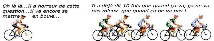 ![]() Ils vont peut-être finir par comprendre, mes petits coureurs. Le problème n'est pas d'aller (ni pour eux de pédaler), aller, aller, ça va... On sait tous où on va, comment ça finit . Le problème, c'est d'être,... ![]() - Mais en attendant quoi ? - Mais d'y aller, connards ! |