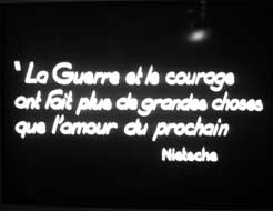 s'est engagé.Ma photo n'est pas très nette, je ne m'y attendais pas. L'intellectuel, joué par Artaud s'est engagé. Mais Artaud lui-même n'était-il pas d'accord pour jouer ce rôle-là puisqu'il l'avait défendu devant les surréalistes ? " Ma chère Maman Nous montons ce soir. Ce sera mon baptême du feu ![...]Je vais au combat pour soulager la souffrance et non la répandre autour de moi. Je me suis engagé pour défendre la patrie à qui je dois la fièvre de ma pensée. Mais je veux me battre sans haine ". La lettre filmée est de la main propre d'Artaud : on reconnaît son écriture, (cf ma page sur le cahier de février 48) : rageuse, irrégulière...avec des mots détachés, soulignés ou écrits plus gros que les autres (Patrie). Il écrit à sa mère terré dans un fortin mais il va sortir " ce soir " pour affronter la mort bientôt, la vraie, sans doute, peut-être, dans le champ qu'on appelle de bataille. Artaud est assis dans le coin gauche de l'image, la mère apparaît plein écran, en surimpression, omniprésente. |